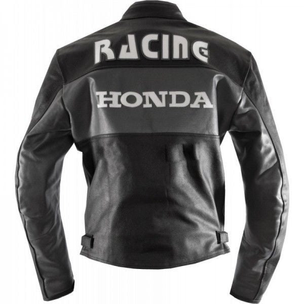 This Honda motorcycle jacket proudly showcases authentic Honda Racing branding and graphics that celebrate the legendary motorsport heritage. The sleek black riding jacket features bold Honda logos, racing stripes, and championship-inspired detailing that makes a powerful statement both on and off the bike. The motorsport leather jacket captures the essence of track performance while maintaining street-ready style that turns heads wherever you go.